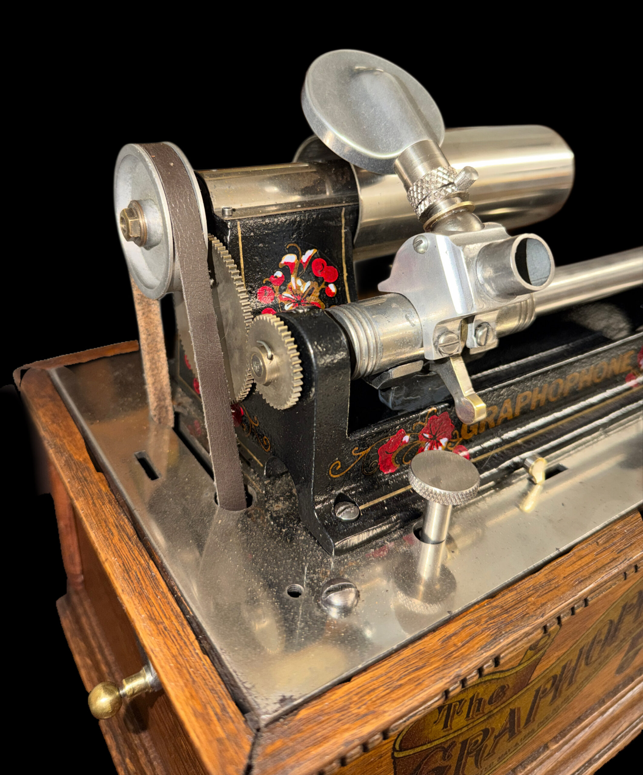 This machine represents the first and most ornate version of the AT, identifiable by its more elaborate cabinet profile, decorative front pillars, and the elegant banner decal that distinguishes this early design. Columbia equipped the AT with several thoughtful improvements over earlier models, including the distinctive “pull‑out, slide‑down” lid latch, a clever feature intended to secure the lid during transport and protect the mechanism within. This particular unit has just undergone a comprehensive, museum‑quality restoration, addressing both mechanical and cosmetic elements with care and historical accuracy. The motor has been fully serviced for smooth, reliable operation, and the cabinet has been restored to bring out the warmth and depth of its original finish. The machine is paired with a reproduction nickel horn that complements the period aesthetic beautifully.