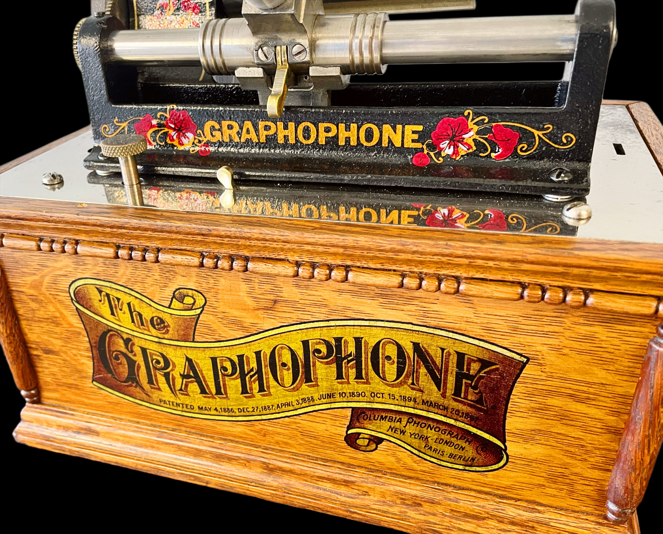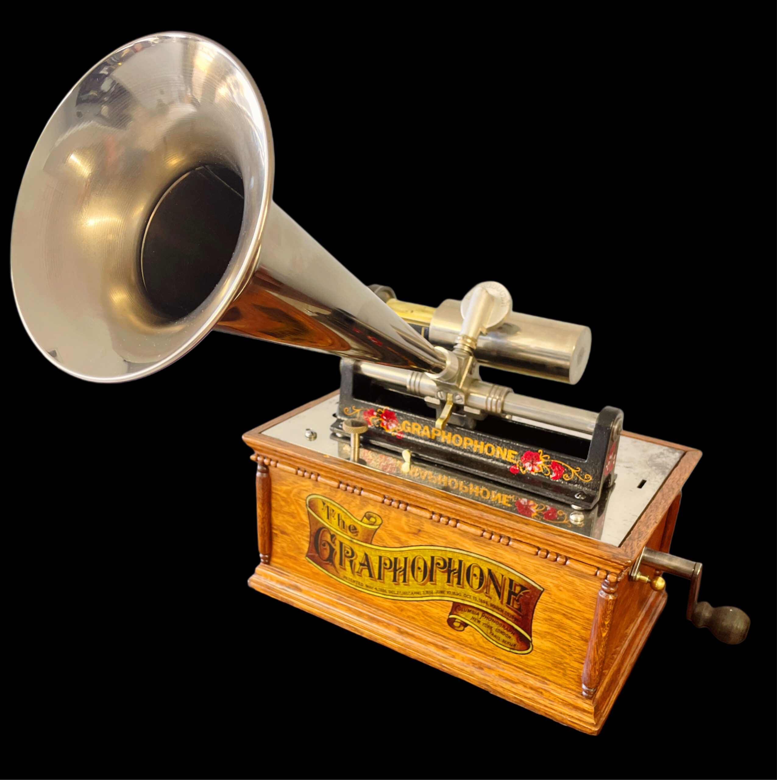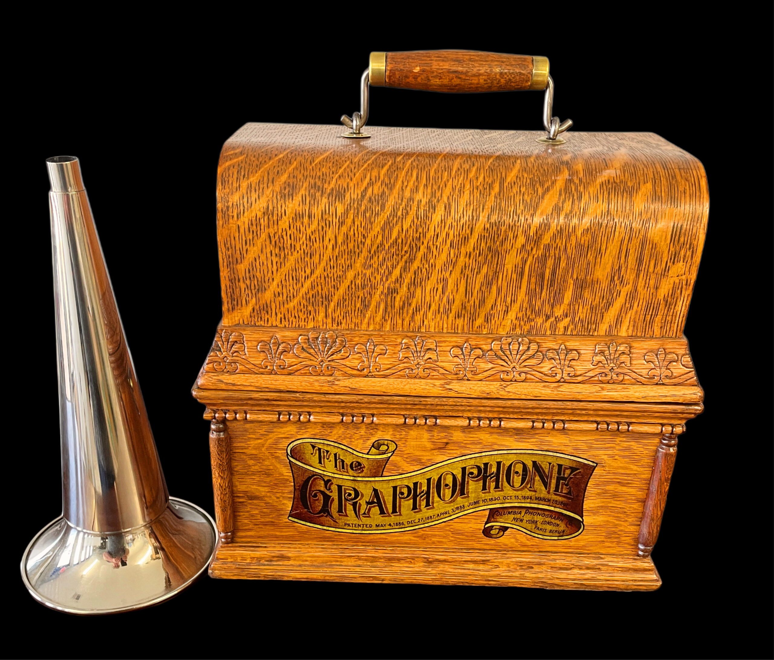 The Columbia AT model was created before the Columbia A, with its last recorded production date in 1898. This machine stands out due to its striking visual appeal, making it a rarer find compared to the A model. It boasts several significant enhancements over its predecessor, adding to its distinctiveness. Among the three versions of this model, this particular unit is identified as the first version, featuring a more intricate casing. The AT model is celebrated for its upgraded and ornate design, which includes small pillars and a decorative banner decal on the front. It also has a “pull out, slide down lid latch” that allows for safer transportation of the machine. This specific unit has been thoroughly restored, both inside and out, ensuring its durability for future generations. It comes with a reproduction nickel horn that beautifully complements the machine. Presenting itself as a pristine and fully functional phonograph, it exudes undeniable charm. While the nickel bedplate remains in its original state, it does show minor imperfections from its past, which do not detract from the overall appeal of the AT model. This phonograph is undoubtedly a remarkable addition to any collection, ready for enjoyment. As a highly sought-after item, it showcases exceptional craftsmanship. If you are in search of a distinguished first version of the AT model, this is an opportunity you won’t want to miss, as it may not come around again. If you have any questions, please don’t hesitate to reach out. Thank you for your interest.