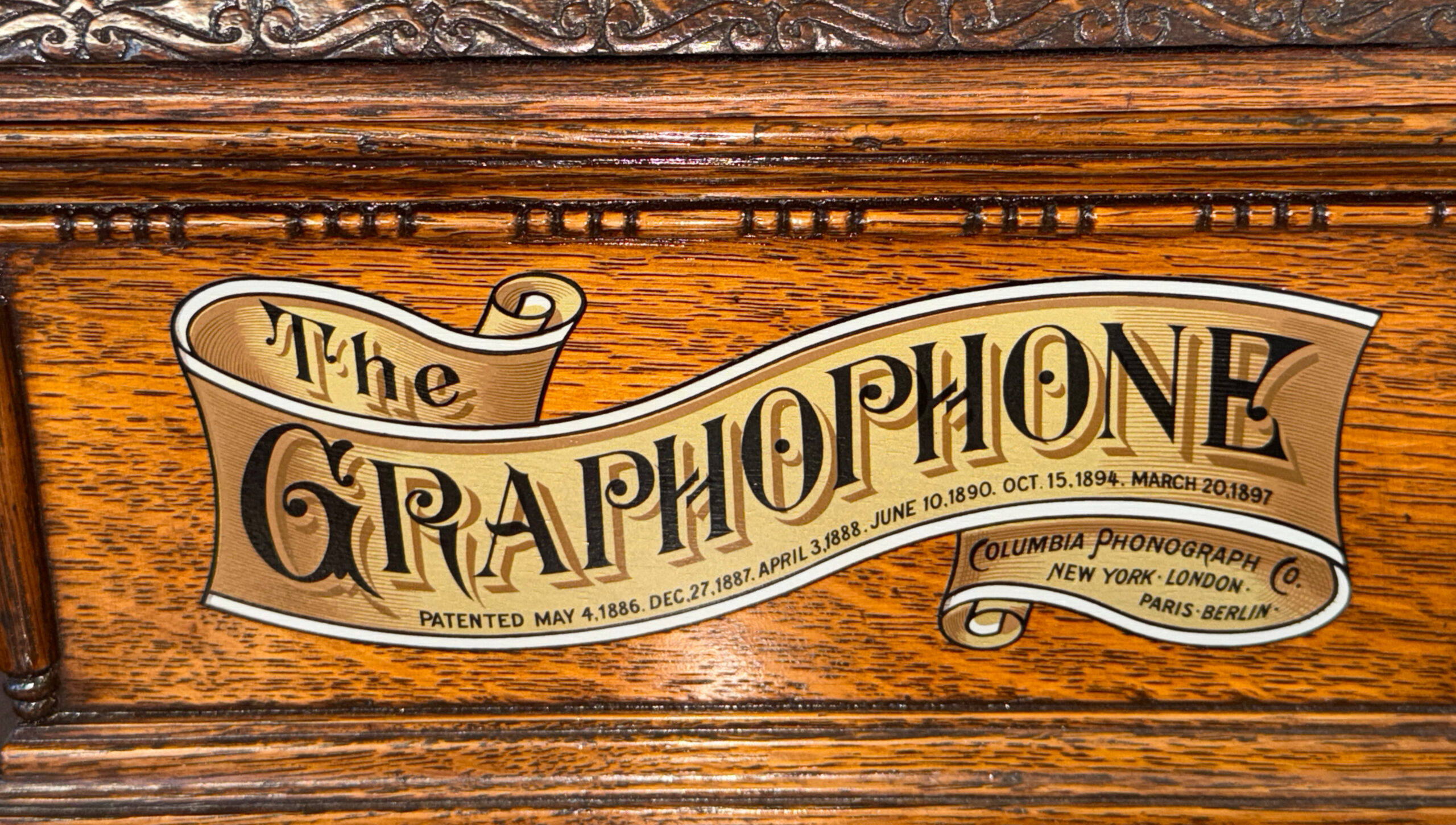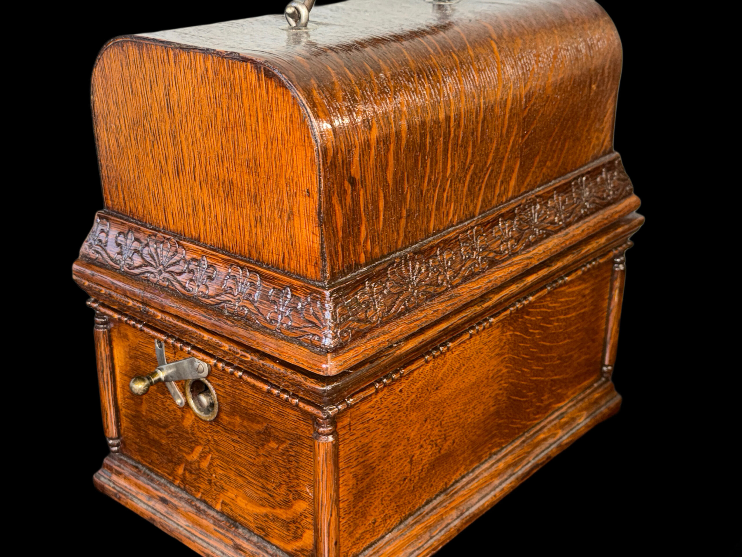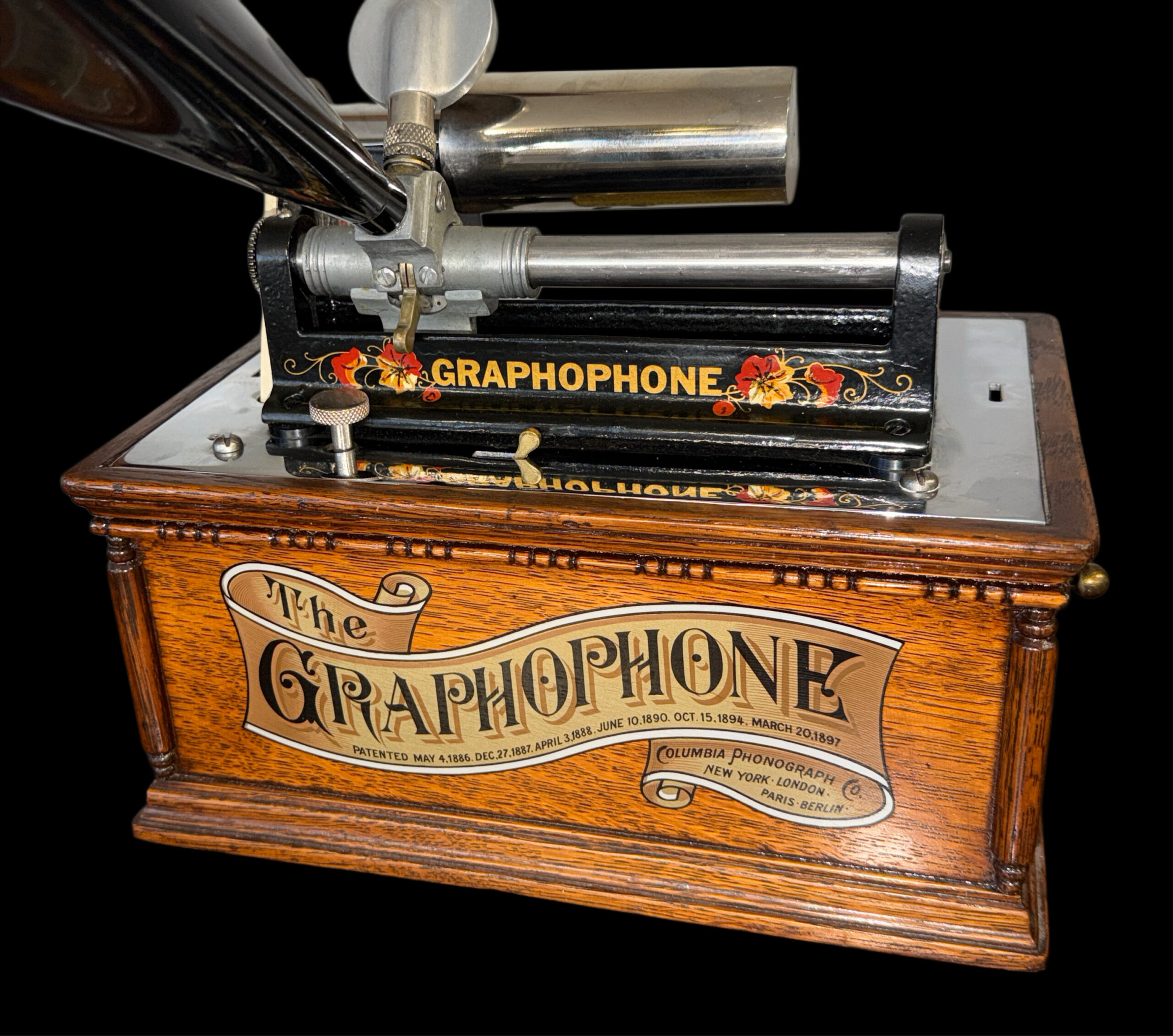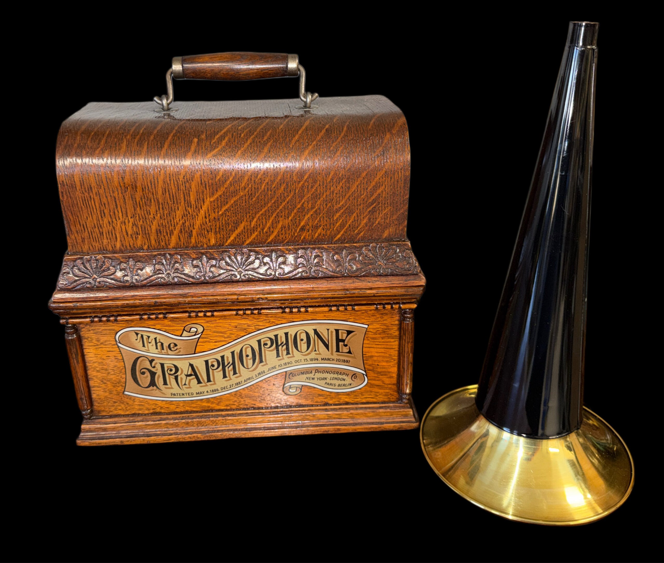 A rare and visually captivating treasure from the dawn of recorded sound, the Columbia “AT” model predates the more commonly found Columbia “A” and was last produced in 1898. This particular unit represents the earliest and most ornate of the three known AT variants—distinguished by its intricate cabinet design, decorative front banner decal, and elegant corner pillars that elevate its architectural presence. Unlike its successor, the AT model introduced several mechanical and aesthetic enhancements, including a unique “pull-out, slide-down” lid latch designed for secure transport—a thoughtful innovation for its time. This example has been meticulously restored inside and out, preserving its mechanical integrity while honoring its historical character. It remains fully functional and ready to play, offering both sonic charm and visual splendor.