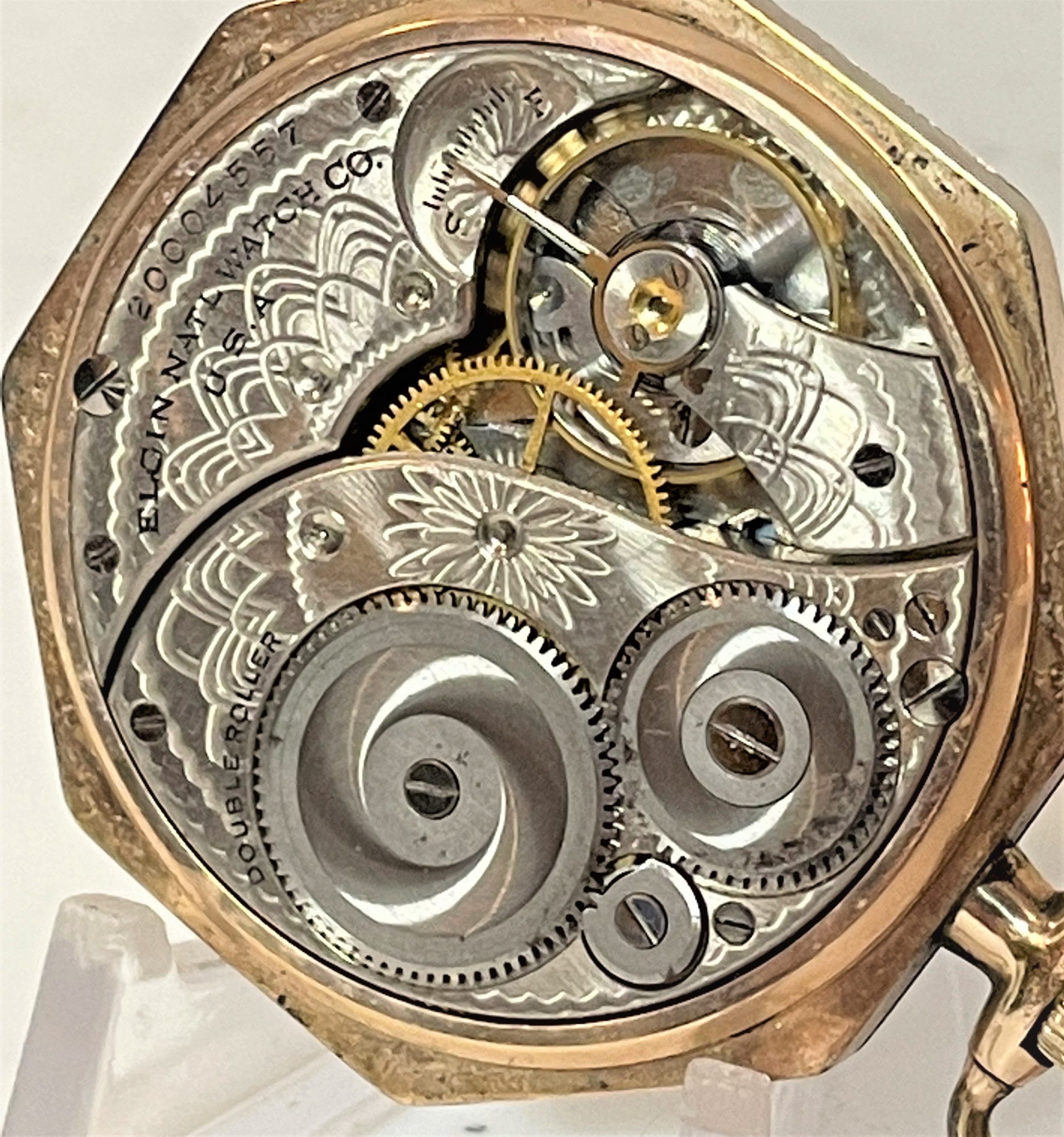 This Men’s Elgin 12 size watch features a Yellow Gold-Filled Octagon Case. It’s a well-functioning 12 size, 7 jewel Elgin, encased in a 20-year yellow gold-filled setting with a green emerald atop the winding stem. A stunning dress watch nestled within a magnificent case, showing no visible wear. The movement is clean, and it has a single sunk Arabic dial with a minor hairline from the “12 o’clock” position to the seconds bit, which is hardly noticeable and could likely be resolved with a thorough cleaning. For additional details, please refer to the pictures. Should you have any inquiries, do not hesitate to ask!