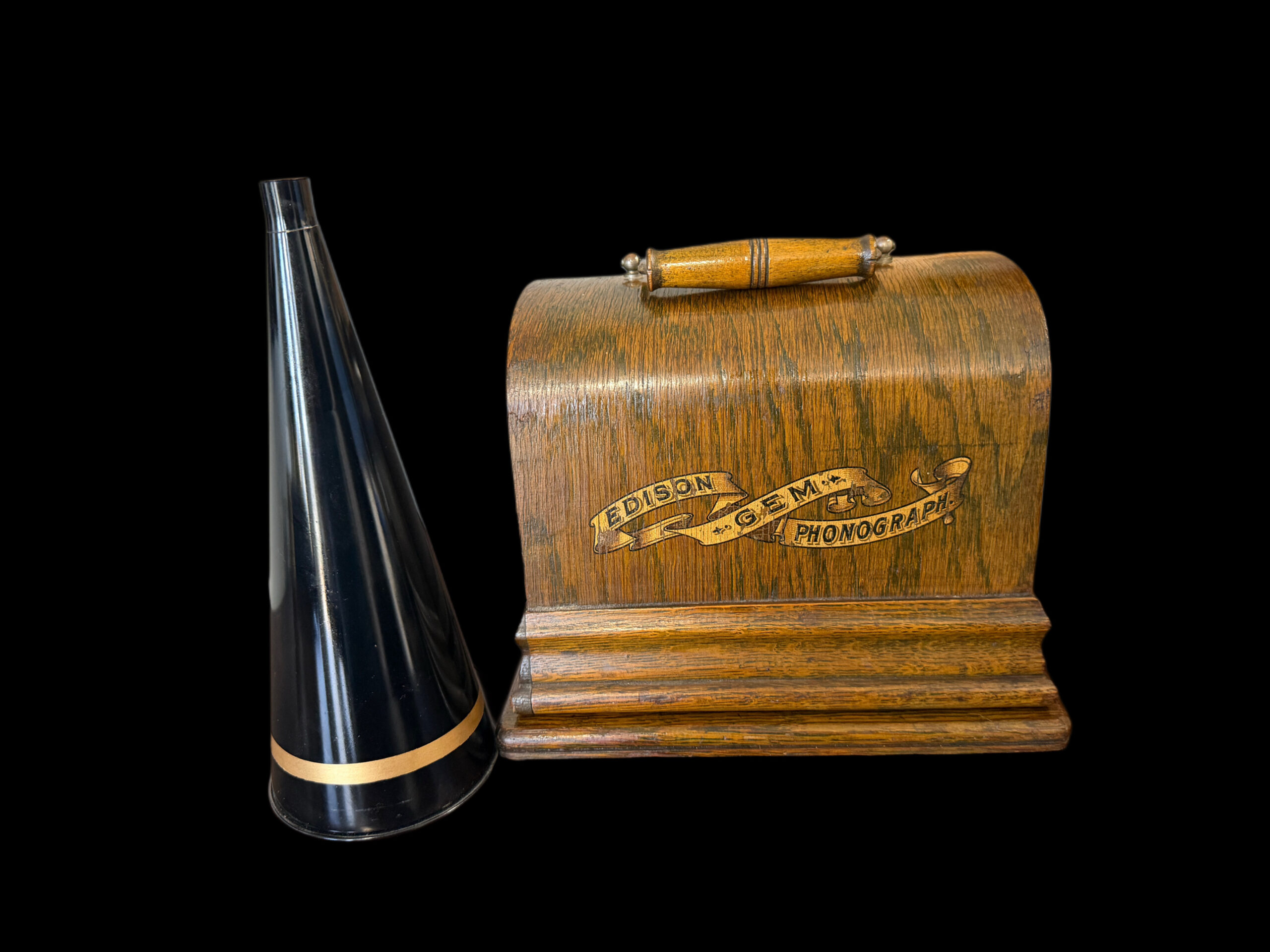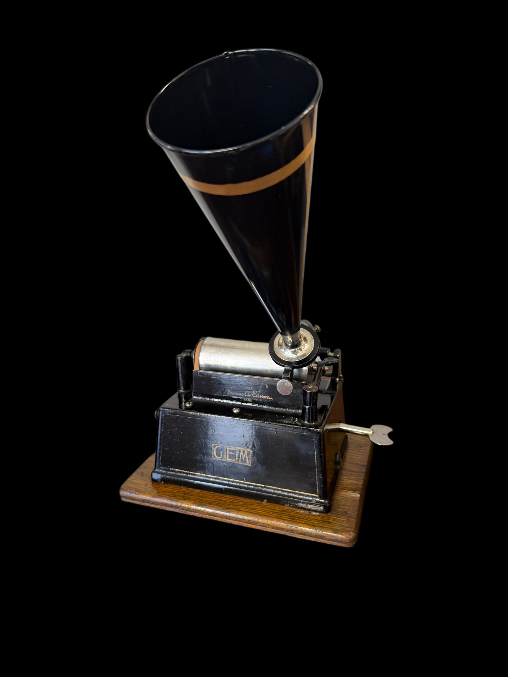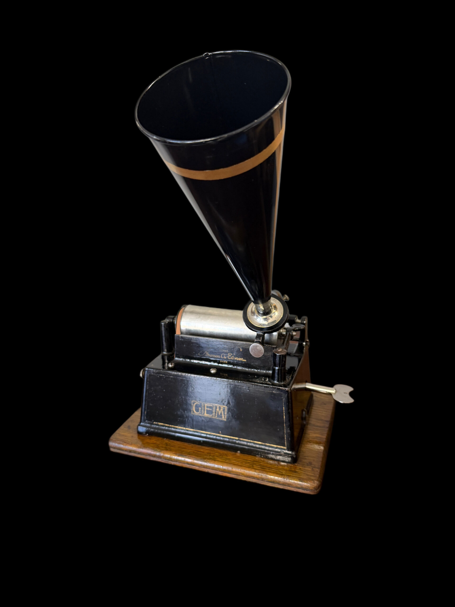 Accompanying the phonograph is the correct early funnel‑type horn, the proper match for this generation of GEM. Its flared profile not only enhances acoustic projection but also completes the authentic silhouette of an early‑1900s tabletop cylinder machine. Winding key included.