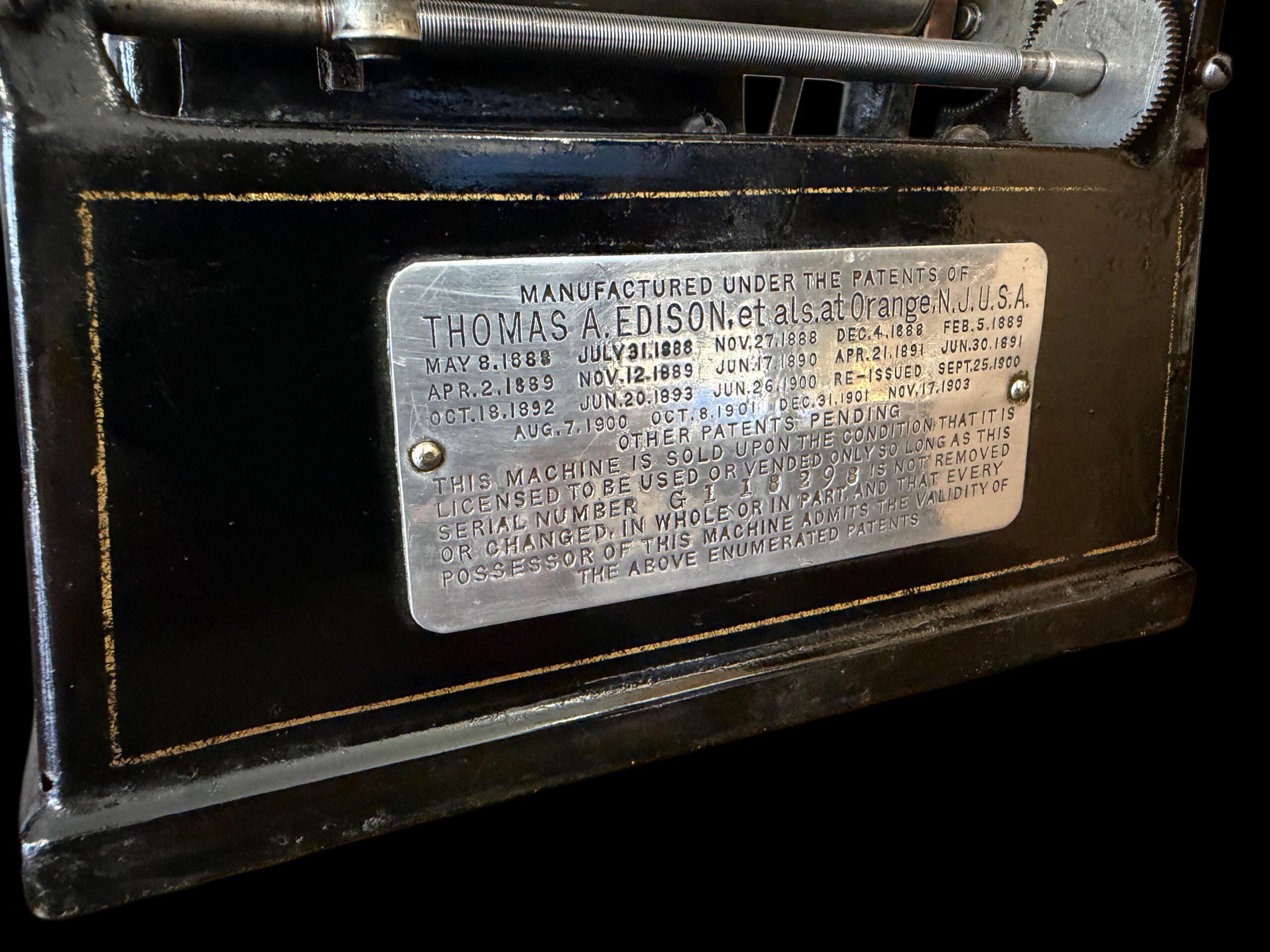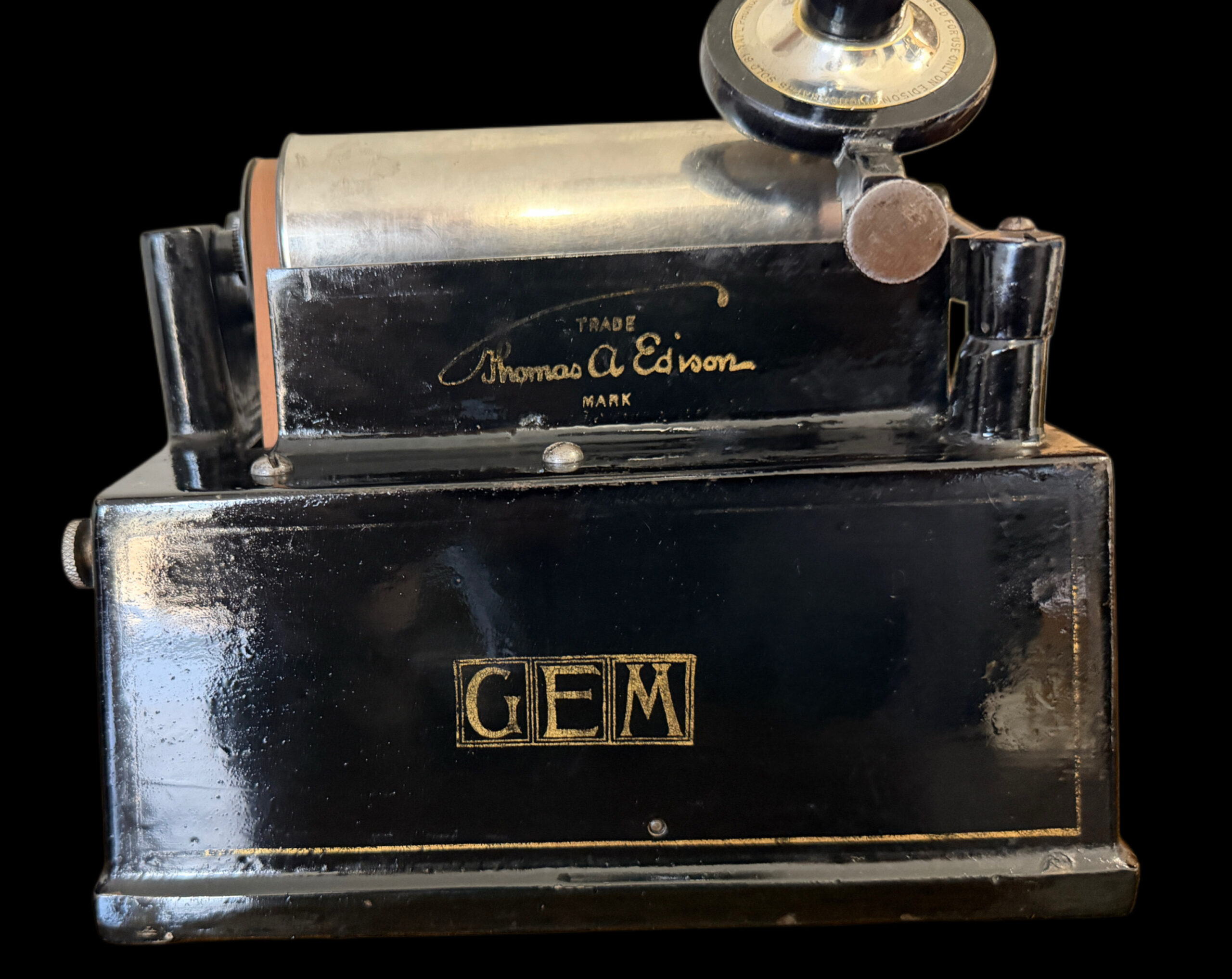 At the front, the iconic arched Edison GEM banner decal remains the defining feature of this early style, proudly announcing the machine’s identity in bold gold script. This banner‑front configuration predates the later side‑label versions and has become increasingly scarce in original, well‑preserved condition.